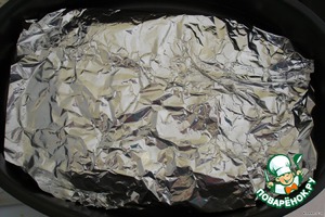 Форму застилаем фольгой, смазываем ее подсолнечным маслом и укладываем рулетики.