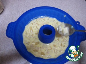Выкладываем в форму ананасы. Осторожно распределяем и перемешиваем ложкой, чтобы ананасы и орешки равномерно распределились по всей массе.