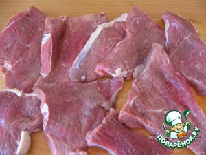 Мясо моем, хорошенечко обсушиваем и режем поперек волокон на ломтики, толщиной в 1 см