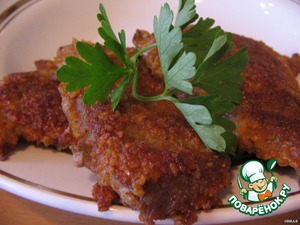 Через 30 мин (как вариант - прибежали с работы, муж срочно потребовал есть) отбивнушки просто панируем в чем душе захочется (сухари, мука, кунжут, зелень, паприка, овсяные хлопья, кукурузные хлопья.............. вариантов масса) и быстренько обжариваем на хорошо разогретом растительном масле до готовности (2-3 мин с каждой стороны).