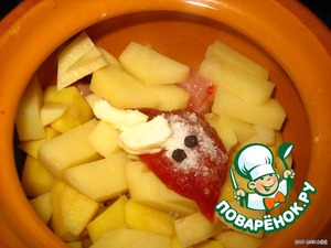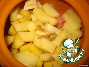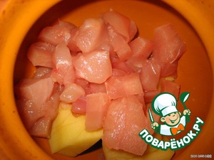 Кладем в горшочек слой картофеля, слой филе, слой картофеля, потом приправы (кетчуп, горчицу разведенную, горчицу в семенах, соль, перец, зиру, лаврушку и капельку соевого соуса в конце, потом все заливаем КИПЯТКОМ!!! и в ХОЛОДНУЮ духовку до готовности..