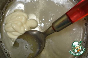 Желатин замачиваем на 10 мин в холодной воде и прогреваем на маленьком огне до растворения крупинок (не кипятить!). Немного остужаем и вливаем майонез.