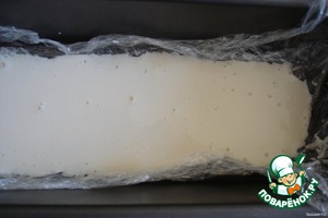 Дно формы выстилаем пищевой пленкой и наливаем часть майонеза с желе.