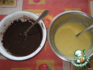 в растопленный шоколад с маслом добавить в каждую миску по 100 гр сахара, по 2 яйца и отдельно: в тёмный шоколад 30-40 гр какао, а в белый шоколад - 30-40 гр муки...
