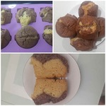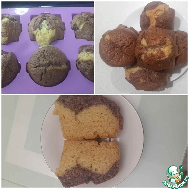 Затем ложкой ровно посередине проводим линию, чтобы перемешать два вида теста...