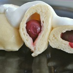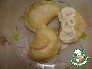 Отрываем кусочек теста, формируем из него колбаску и нарезаем не очень маленькими кусочками. Из них делаем лепешечки, кладем в каждую несколько вишен и 1 ч.л. сахара.