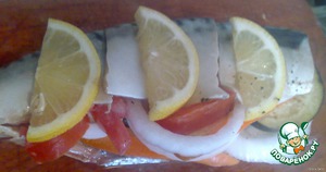 3.Рыбу посолить, поперчить внутри, нафаршировать: луком, помидором, баклажаном, морковкой, сверху положить дольки лимона.
