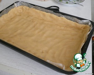Форму выстелить бумагой для выпечки. Выложить тесто в форму, распределить по дну и бортикам. Поставить в холодильник минут на 20.