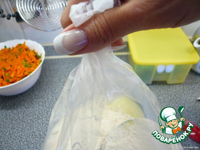 Защемляем пакет сверху пальцами и трясём мешочек туда-сюда, пол-минутки хватает.
