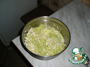 Сначала начинка. Делается на ночь. Капусту нарезать, сварить яйца и нарезать (как на салат).