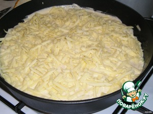 В сковороду выливаем половину теста, потом начинка. Сверху на начинку режем сливочное масло, потом остальное тесто. Сверху трём сыр.