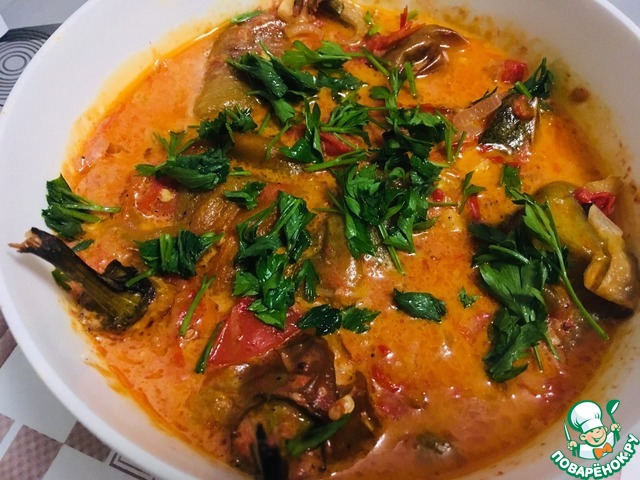 Рецепт взят с сайта "Кулинар". Поделилась им Cat: "Сразу предупреждаю - это блюдо для "теплой компании", под шашлычок на даче и т. д. Парадным его в силу специфики поедания представить трудно(но может быть можно?)... В чем состоит "непарадность". Берется перчик (руками) за плодоножку, тщательно жулькается в соусе - и в рот. Можно, наверное, вилочкой - без комментариев! Когда перцы и помидоры съедены, в ход как-то сразу идут кусочки хлеба (для обмакивания в соус). Кстати, практически самая вкусная часть перцев - это та самая не вычищенная часть с семенами... " Подтверждаю - блюдо действительно очень вкусное. Но нам понравилось есть не холодным, как советует автор, а горячим, с пыла с жара.