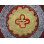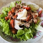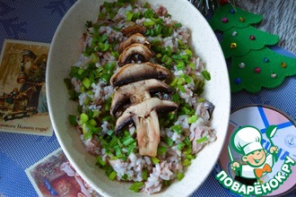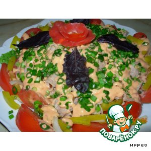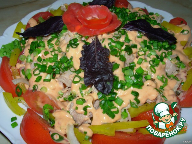 Нанести на салат решетку из соуса, посыпать зеленым луком.