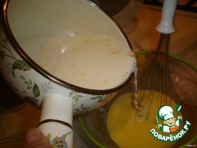 • Далее, взбивая венчиком яичную массу, влить в нее молоко.