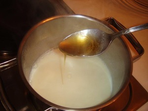 Добавляем в молоко мёд и размешиваем. Получившуюся медово-молочную смесь убираем в холодильник, как только из кастрюльки перестанет идти пар.