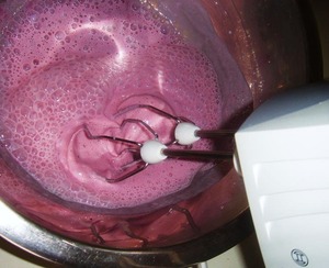 Теперь медленно вливаем молоко в посуду с ягодным пюре. И одновременно начинаем всё очень быстро размешивать, чтобы молоко не свернулось. Лучше на этом шаге использовать миксер. -