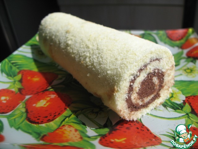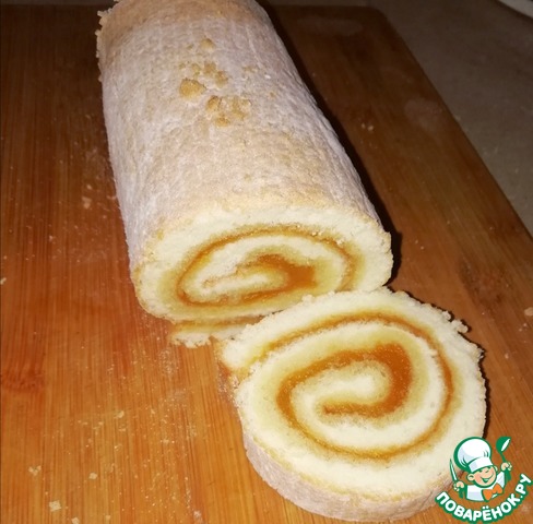 Рецепт «Бисквитный рулет с кремом и вишнeвым джемом»: