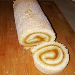 Не смогла я его завернуть. Твердый какой-то. Потом решила полоску сделать вместо рулета, разрезала, пропитала сиропом. Все-равно резиновый...