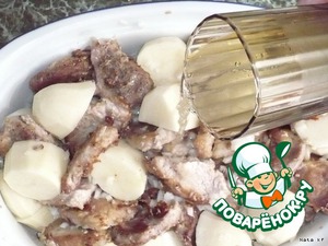 Залить вином, накрыть крышкой и отправить на 60 минут в разогретую до 180 градусов духовку