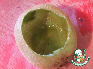 Чайной ложкой вытаскиваем из кожуры мякоть киви. Делаем это осторожно, не повредив кожуру.