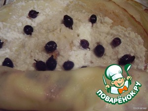 блинчик смазать творожной массой и посыпать черной смородиной, свернуть трубочкой