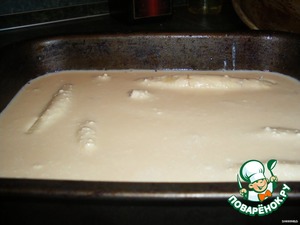 Творог разотрём с остальными компонентами и выливаем на бананы сверху -
