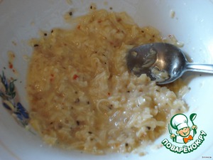 Измельчаем чеснок, натираем сыр и добавляем все это к приготовленной смеси. Тщательно перемешиваем.