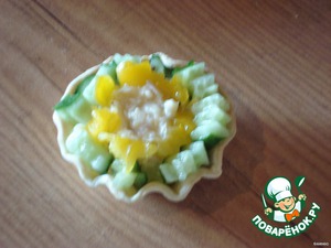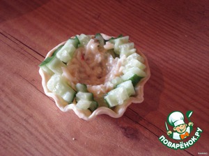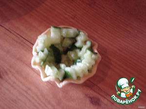 А теперь наполняем корзиночки. Первым слоем выкладываем огурцы, а на них соус.