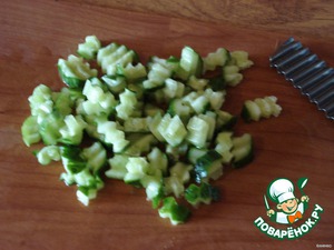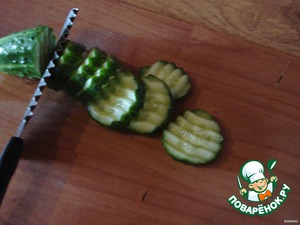Берем огурцы и с помощью волнистого ножа нарезаем небольшими кусочками. -