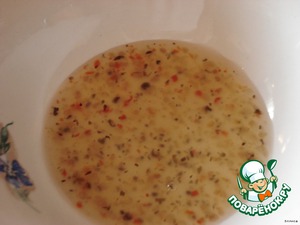 Для этого смешиваем оливковое масло, винный уксус, молотую паприку, лук-пудру, сушеную кинзу, душистый и черный перец и немного соли. -