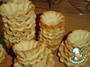 Размягченный маргарин взбить, соединить с приготовленной массой и остатком муки. Раскатываем тесто и вырезаем кружки по размеру формочек. Выкладываем кружочки в формы, смазанные маргарином, дно прокалываем.