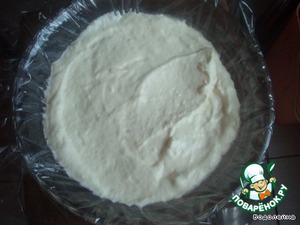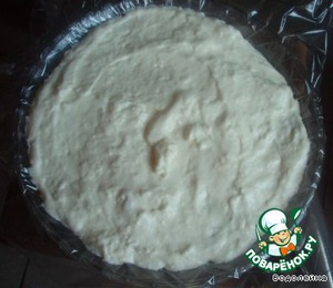 • Застилаем блюдо с высокими бортами пищевой пленкой и выкладываем немного крема.