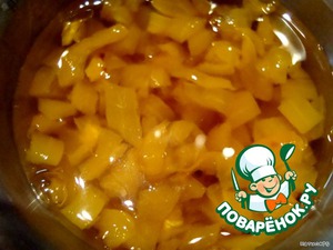 • Вторым слоем кладем желтый перчик, заливаем бульоном, убираем в холодильник