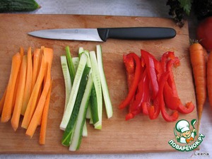 Морковь, огурцы и перец порезать соломкой, приблизительно одинаковой длины и толщины.