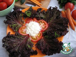 На блюдо выложить листья салата, помидоры, порезанные колечками. В центр поместить майонез или любой соус на майонезной основе (можно налить в пиалочку и поставить в центре блюда).