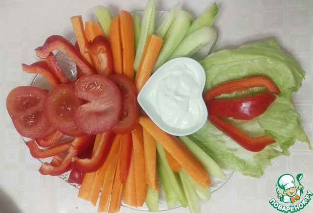 Легкое, свежее, простое в приготовлении блюдо. Такая закусочка демократично объединяет всех за общим столом по тому же принципу что и фондю: взял овощную палочку, макнул в соус - весело и оригинально! А главное нарядно смотрится на столе. Это мой дебют на Поваренке :) На конкурс "Овощной светофор"