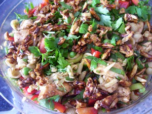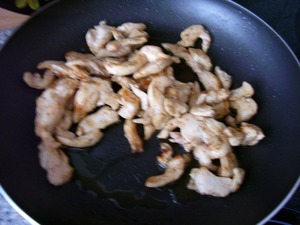Куриное филе порезать, посолить, поперчить и обжарить на сильном огне.