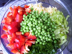 Горошек на 5 минут залить кипятком. Порезать помидоры, паприку и лук. Натереть сыр на крупной тёрке.