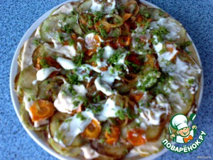 Сначала кабачки, затем морковь с луком, смазываем соусом. -
