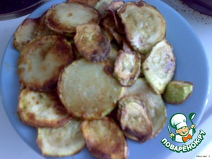 Овощи моем, очищаем от кожуры. Кабачок трем на терке, чтобы получились тонкие кружочки. Насыпаем в тарелку муку, смешиваем с солью. Каждый кружочек кабачка обмакиваем в муку и обжариваем в растительном масле до золотистого цвета.