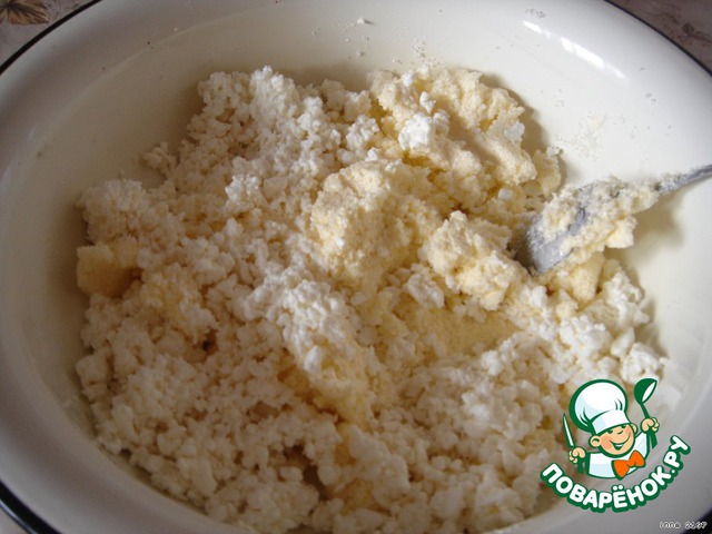 Размягченное слив. масло или маргарин растереть с сахаром.Добавить творог и тщательно растереть.