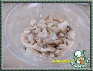 Выньте рыбу из отвара,очистите от стеблей укропа, чуть отожмите ее, но не сильно, чтобы оставалась сочной.Удалите все косточки.