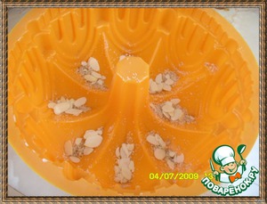 Дно формы смазать или проложить пекарской бумагой. Обсыпала листиками миндаля.