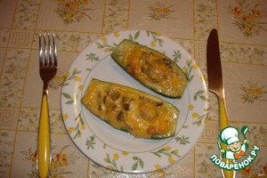Огурцы и куриное филе перемешиваем с майонезом. Эту смесь выкладываем в кабачки, посыпаем, не жалея, тертым сыром.