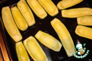 Моем кабачки, разрезаем их пополам. Чайной ложечкой удаляем сердцевину, слегка натираем солью.