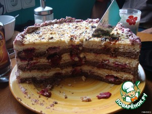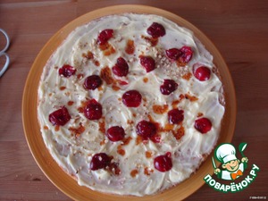 Далее накрываем ванильным коржом, смазываем белым кремом и также кладем половинки вишни, орехи и жженый сахар, и продолжаем так до последнего коржа.