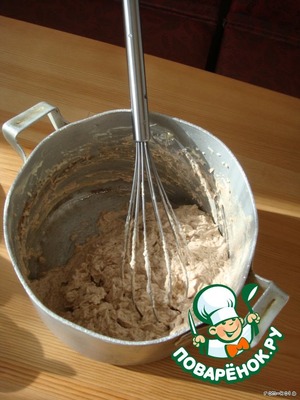 Взбиваем шоколадный крем: сливочное масло размягчим и размешаем деревянной ложкой или лопаткой, добавим примерно 10 ст. л. сгущенки (попробуйте по вкусу) и 1 ч. л. какао. Все взобьем (я взбивала вручную, совсем не трудно).