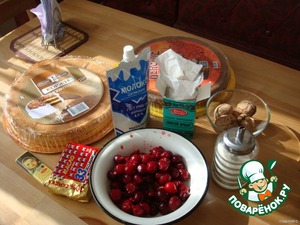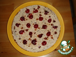 Кладем корж на блюдо (я клала первым шоколадный), смазываем кремом (я мазала шоколадным), вишню режем на половинки и выкладываем на крем, орехи размельчим (я мельчила в блендере) и посыплем сверху.