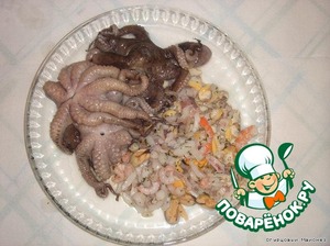 Подготавливаем морской коктейль и три осьминожки. Если были замороженные - размораживаем.
