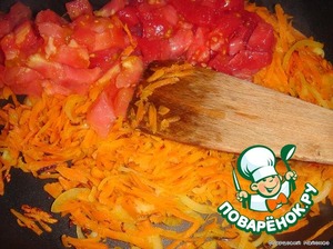 Берём глубокую сковороду и делаем зажарку на сливочном масле из лука и моркови, туда же кидаем два очищенных измельченных помидора. Возможно сделать на оливковом, однако, не всем может понравиться запах.